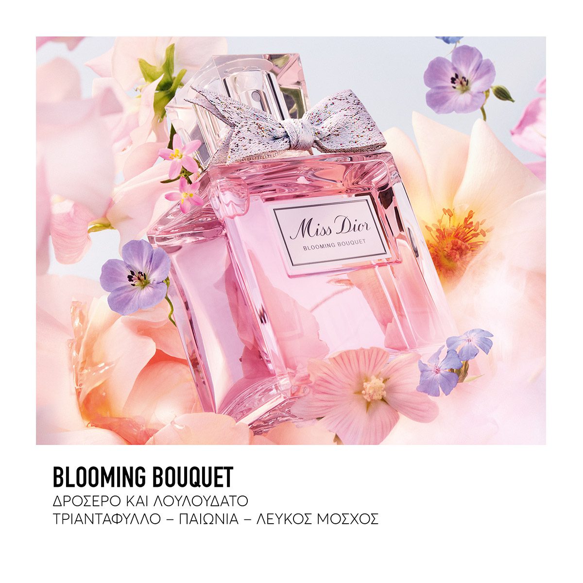Το Miss Dior Blooming Bouquet είναι ένα δροσερό και τρυφερό eau de toilette που αποπνέει φρεσκάδα και ζωντάνια. Η σύνθεσή του περιλαμβάνει νότες τριαντάφυλλου Δαμασκού και παιώνιας, αναδεικνυόμενες από το περγαμόντο Καλαβρίας και περικυκλωμένες από λευκό musk, προσφέροντας μια απαλή και ανακουφιστική αίσθηση. Το μπουκάλι, με τον φιόγκο υψηλής ραπτικής, προσθέτει μια εκλεπτυσμένη και ντελικάτη πινελιά, ενώ διατίθεται και με roller-pearl για ευκολία εφαρμογής.